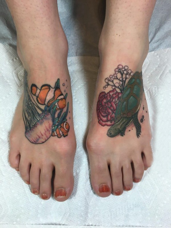 脚背纹身 女生脚背上小丑鱼和海龟纹身图片