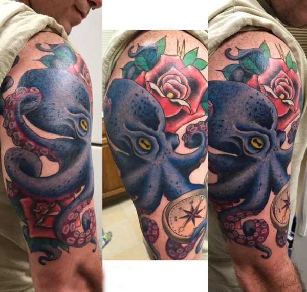 大臂纹身图片 男生大臂上玫瑰和章鱼纹身图片