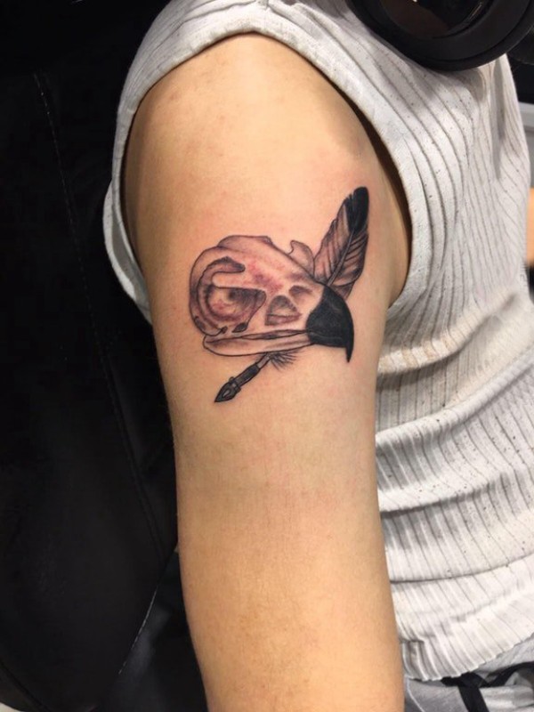 大臂纹身图 男生大臂上羽毛和鸟头骨纹身图片