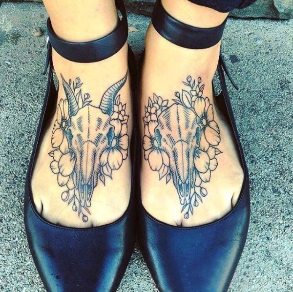 脚背纹身 女生脚背上花朵和动物骨头纹身图片