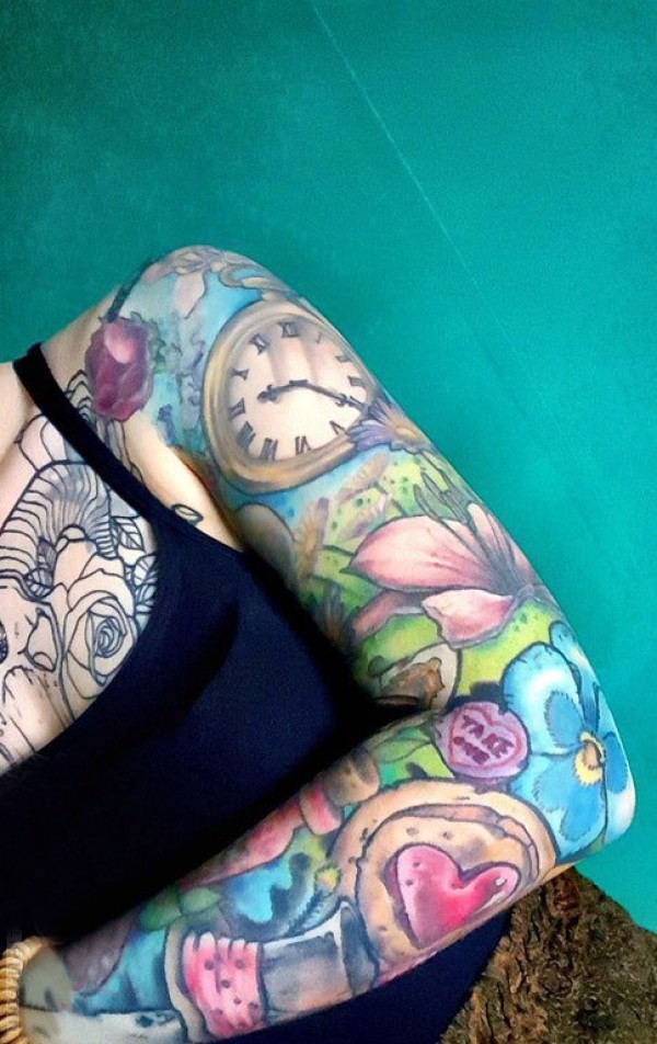 花臂纹身 女生手臂上花朵和钟表纹身图片