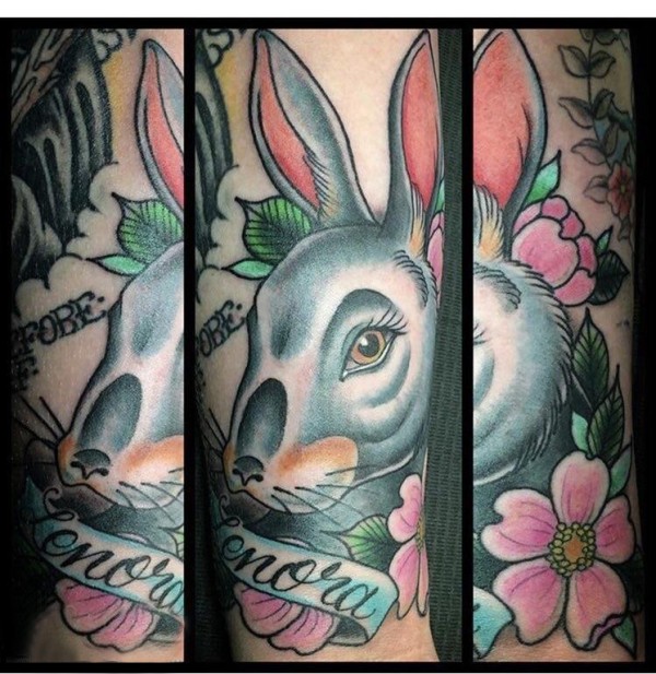 兔子纹身 女生手臂上兔子和花朵纹身图片