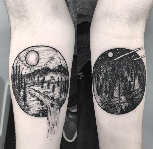 纹身圆形 男生手臂上圆形和风景纹身图片