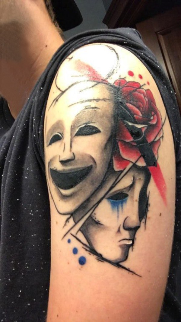 双大臂纹身 男生大臂上玫瑰和面具纹身图片