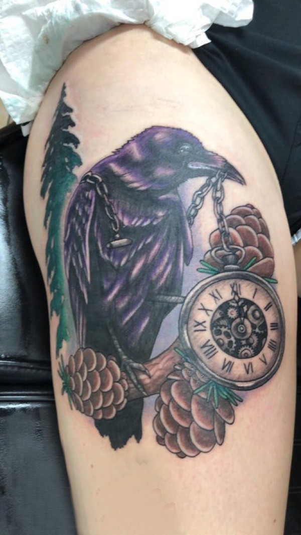 乌鸦纹身 女生大腿上乌鸦和钟表纹身图片