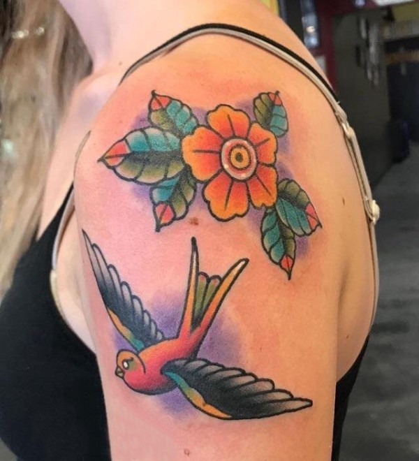 纹身肩部 女生肩部燕子和花朵纹身图片