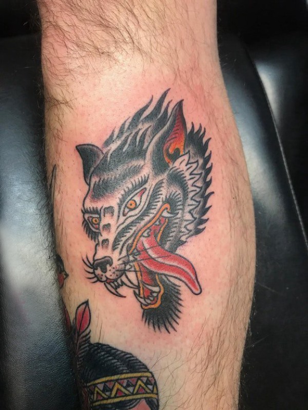 滴血狼头纹身 男生小腿上彩色的狼头纹身图片