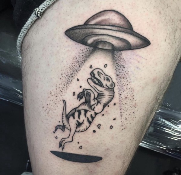 大腿纹身男 男生大腿上飞碟和恐龙纹身图片