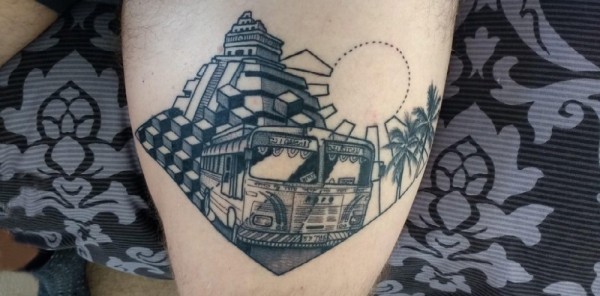建筑物纹身 男生腿上建筑物和汽车纹身图片