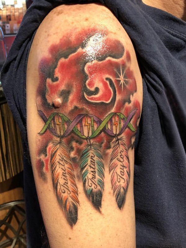 大臂纹身图 男生大臂上彩色的羽毛纹身图片