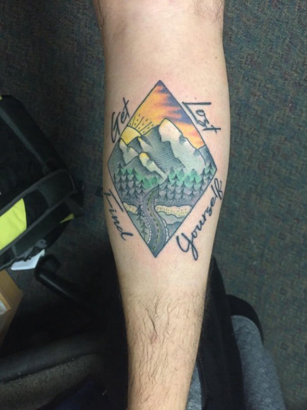 欧美小腿纹身 男生小腿上英文和山水风景纹身图片