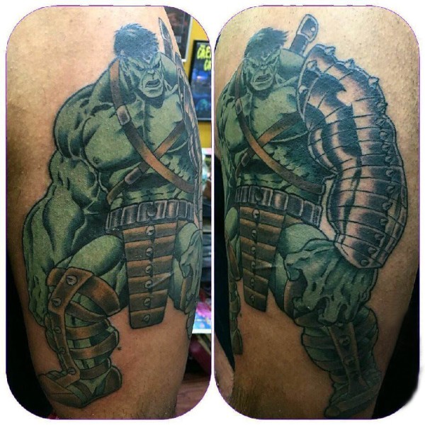 大腿纹身男 男生大腿上彩色的绿巨人纹身图片