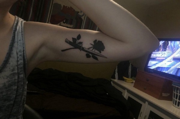 双大臂纹身 女生大臂上匕首和花朵纹身图片