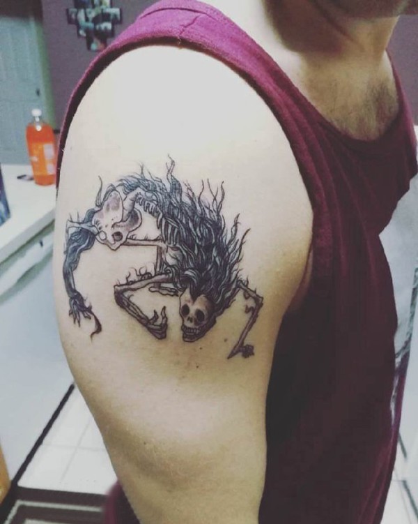 双大臂纹身 男生大臂上黑色的骷髅怪物纹身图片
