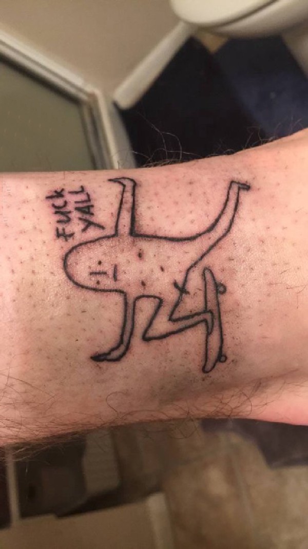 极简线条纹身 男生小腿上英文和卡通人物纹身图片
