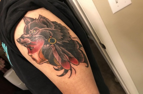 纹身狼和美女纹身图案 男生大臂上狼和美女纹身图片