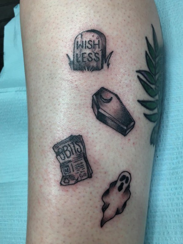 墓碑纹身 女生小腿上黑灰的墓碑纹身图片