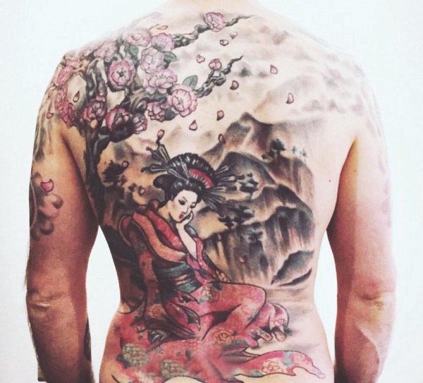 后背纹身男 男生后背上大树和艺妓纹身图片