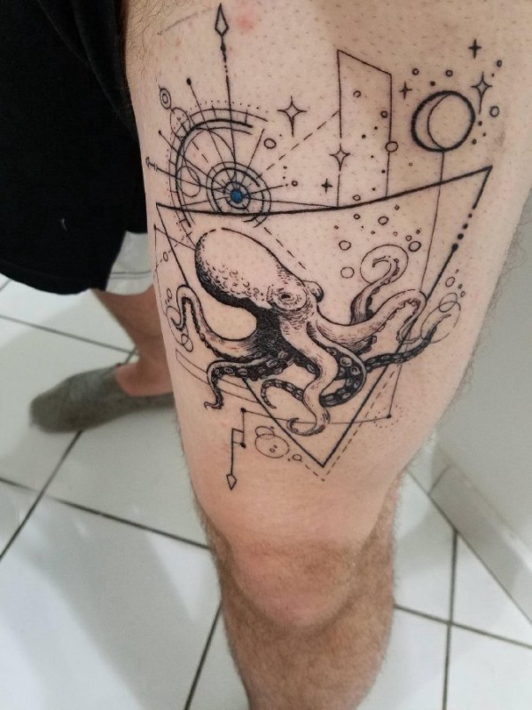 黑色章鱼纹身 男生大腿上黑色章鱼纹身图片
