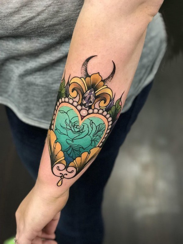 手臂纹身图片 男生手臂上玫瑰和心形纹身图片