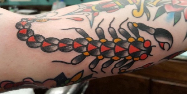 手臂纹身图片 男生手臂上彩色的蝎子纹身图片