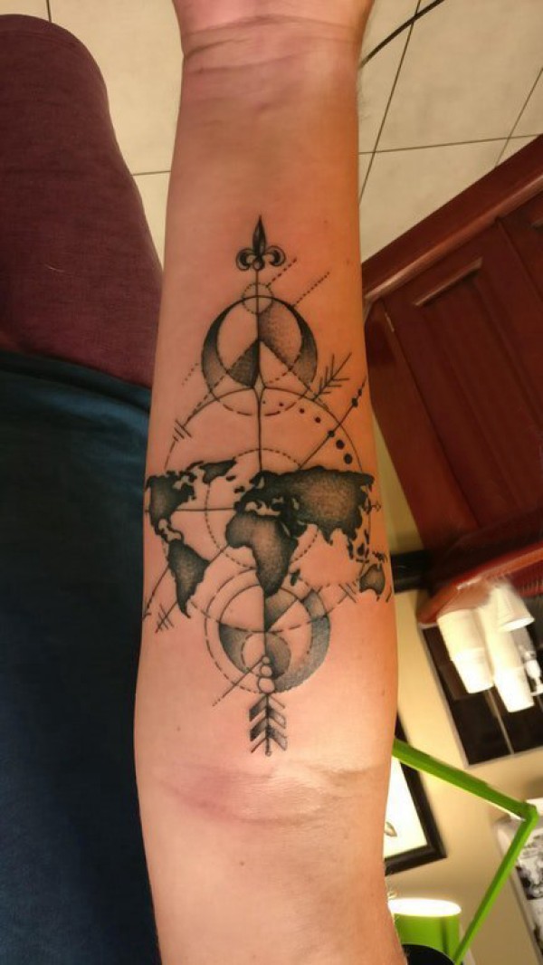 手臂纹身图片 男生手臂上地图和指南针纹身图片