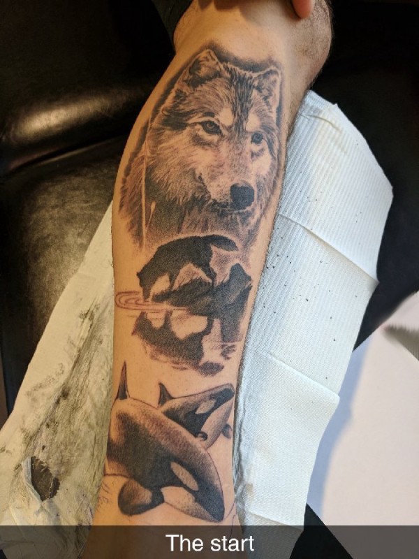 百乐动物纹身 男生手臂上狼头和鲸鱼纹身图片