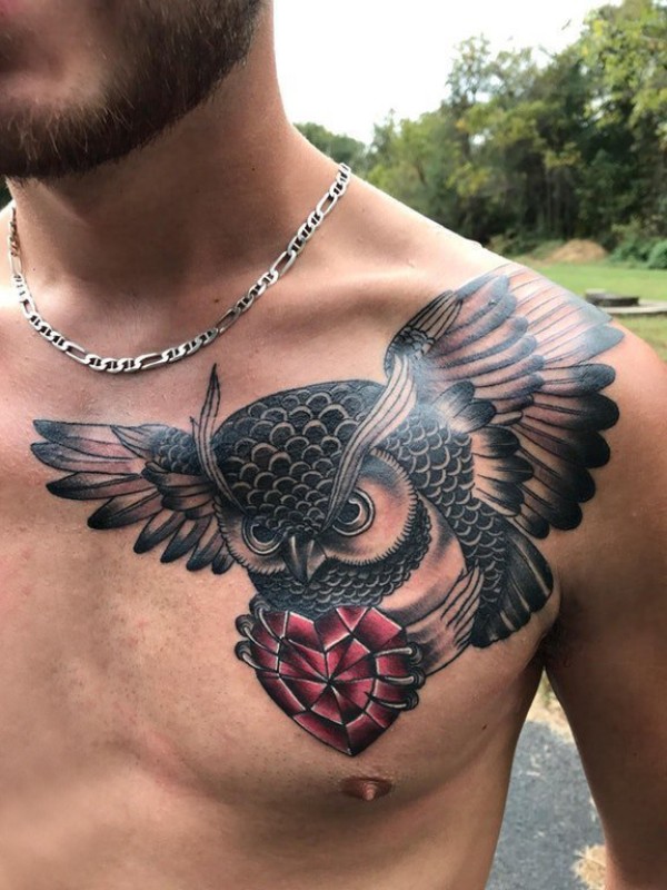 胸部纹身男 男生胸部钻石和猫头鹰纹身图片