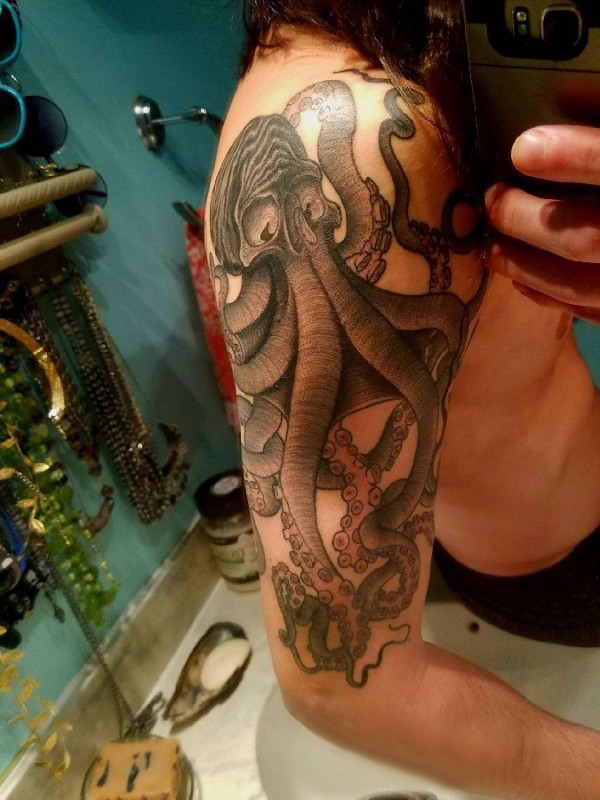 章鱼纹身简单 男生大臂上黑灰的章鱼纹身图片