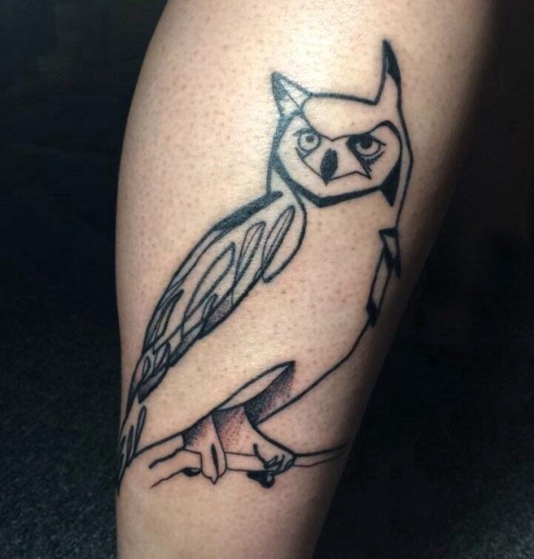 极简线条纹身 男生小腿上黑色的猫头鹰纹身图片