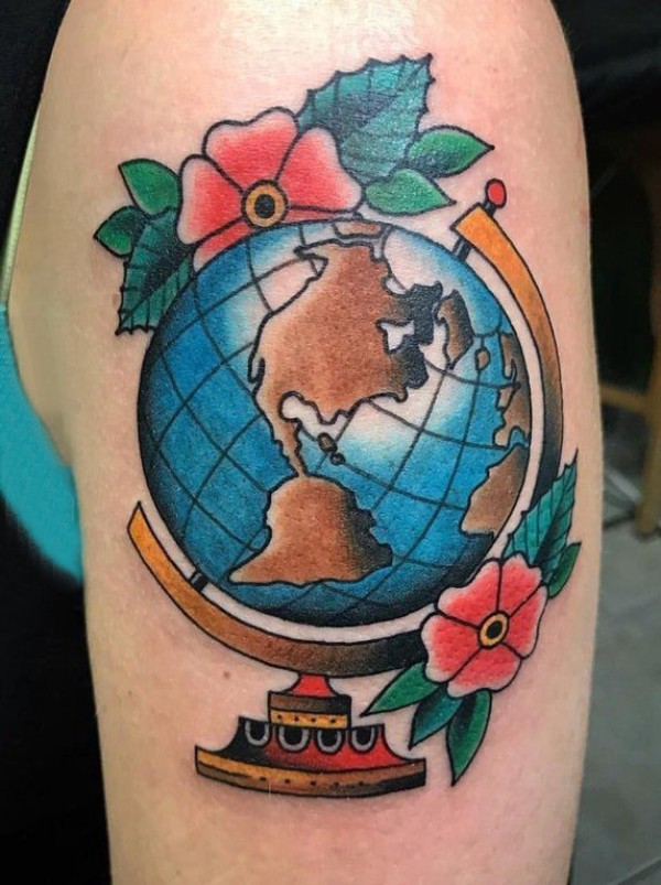 地球纹身图案 女生手臂上地球和花朵纹身图片