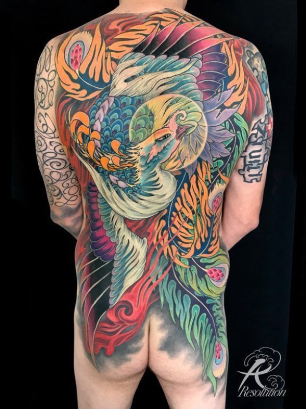 后背纹身男 男生后背上彩色的植物和动物纹身图片