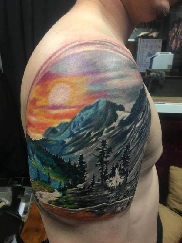 大臂纹身图 男生大臂上彩色的风景纹身图片