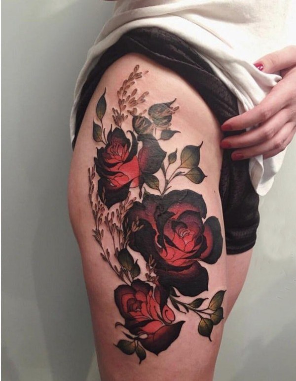 彩色渐变纹身 女生大腿上彩色的玫瑰纹身图片