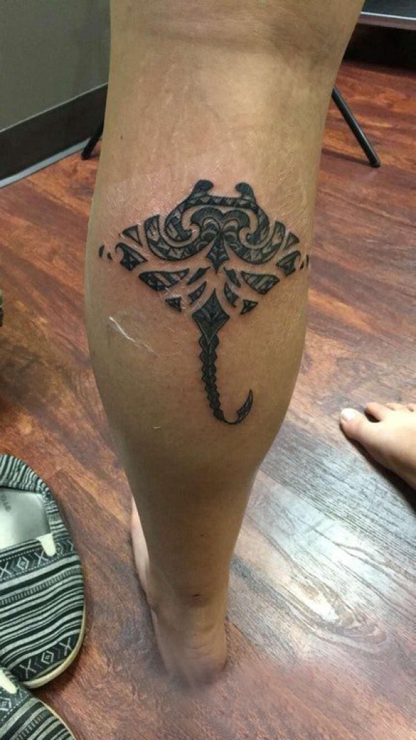 欧美小腿纹身 男生小腿上黑色的鲼纹身图片