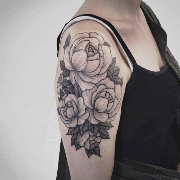 黑灰写实纹身 女生大臂上黑灰的花朵纹身图片