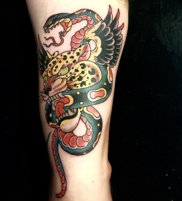 百乐动物纹身 男生大臂上蛇和豹子纹身图片