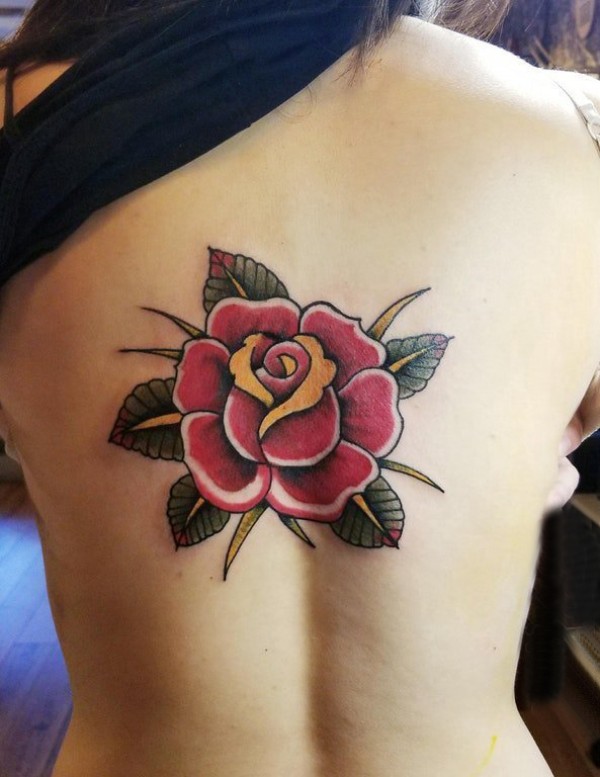 女生后背纹身图 女生后背上彩色的玫瑰纹身图片