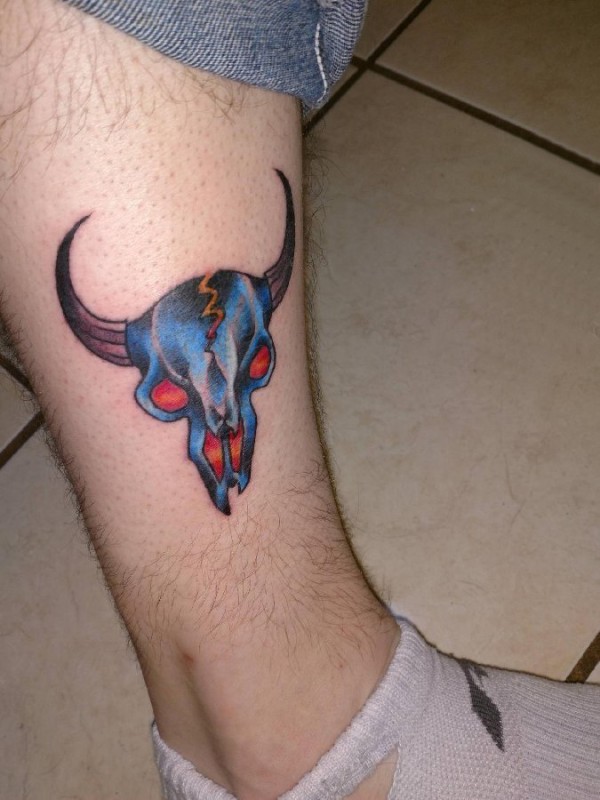 牛头骨纹身 男生小腿上彩色的牛头骨纹身图片