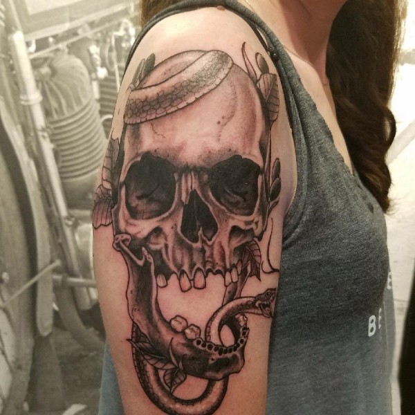 骷髅纹身 女生大臂上蛇和骷髅纹身图片