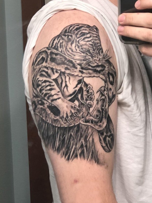 老虎和蛇纹身图案 男生大臂上上老虎和蛇纹身图片