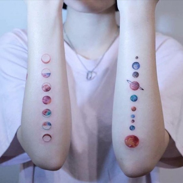 手臂纹身素材 女生手臂上彩色星球纹身图片