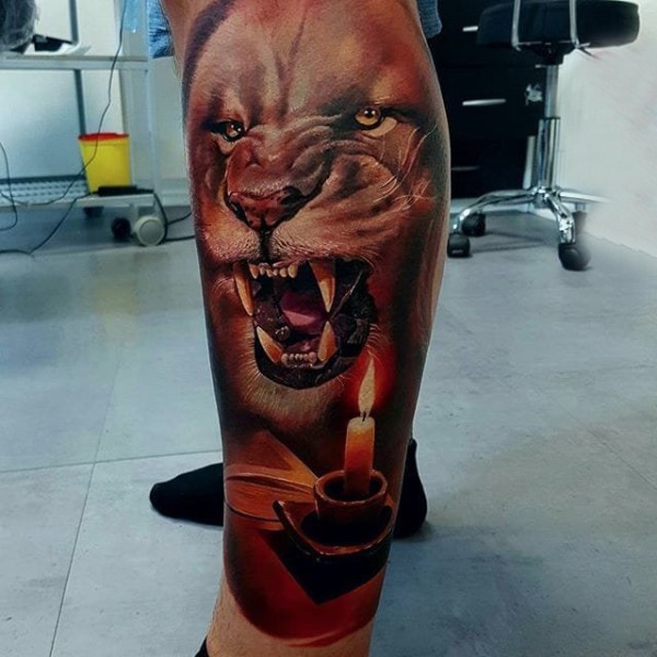 狮子王纹身 男生小腿上彩色的狮子纹身图片