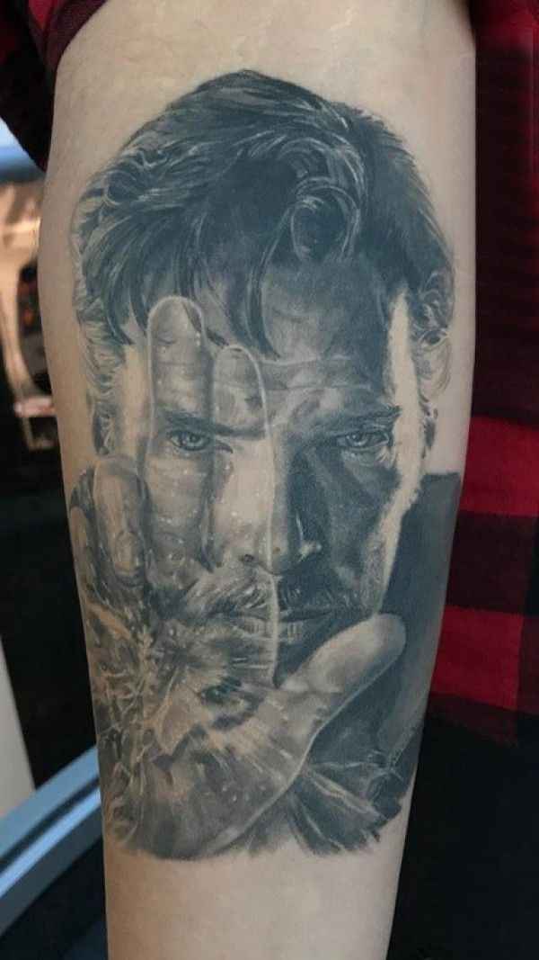 手臂纹身图片 男生手臂上黑灰的明星人物纹身图片