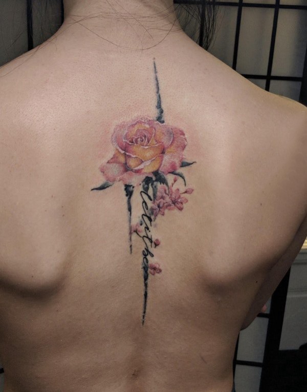 脊柱纹身图案 女生后背上彩色的花朵纹身图片