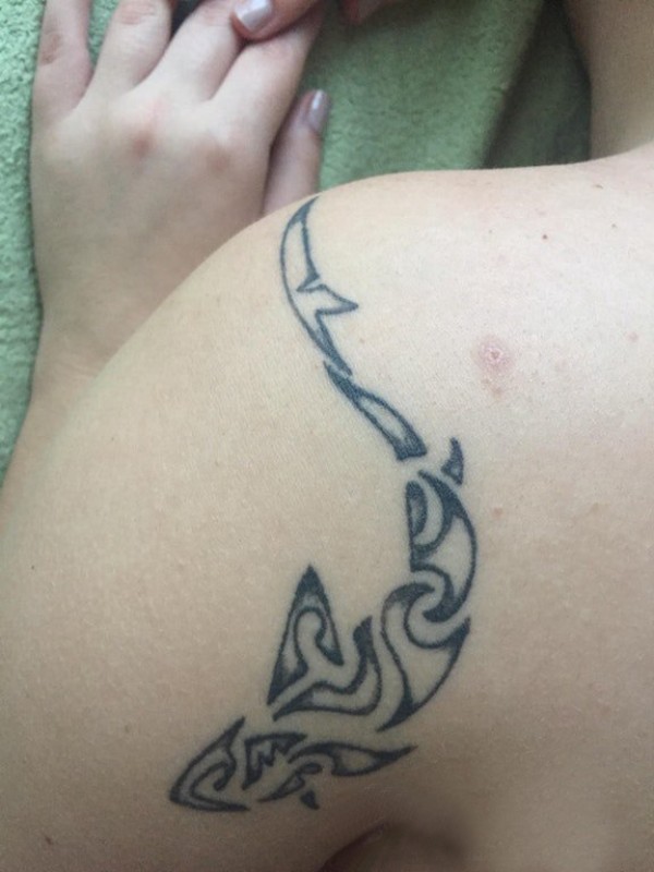 极简线条纹身 女生后肩上黑色的鲨鱼纹身图片