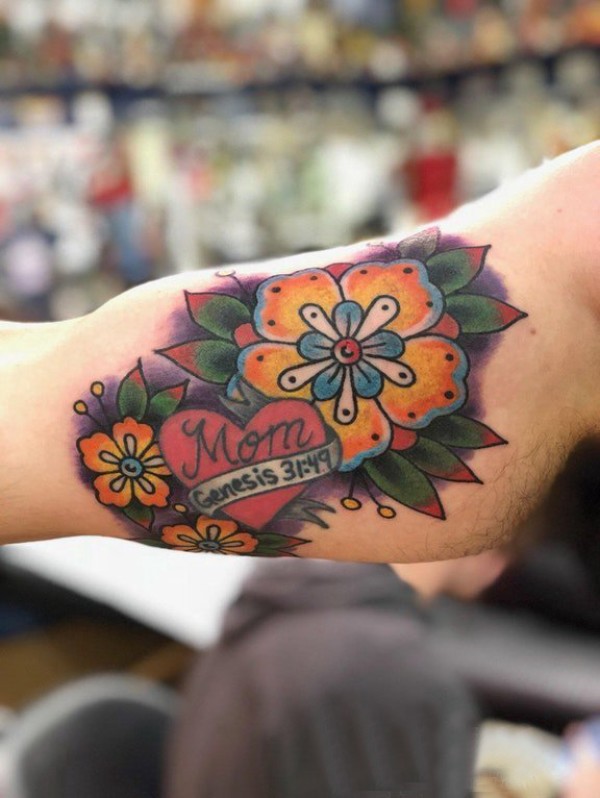大臂纹身图 男生大臂上心形和花朵纹身图片