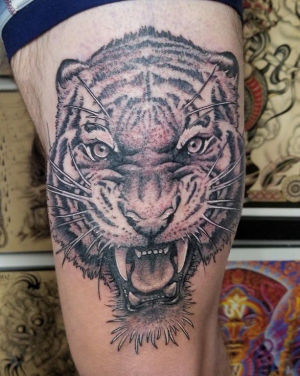 大腿纹身男 男生大腿上黑灰的老虎纹身图片