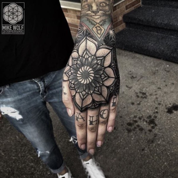 手背到小臂上的黑色点刺梵花纹身图案9张