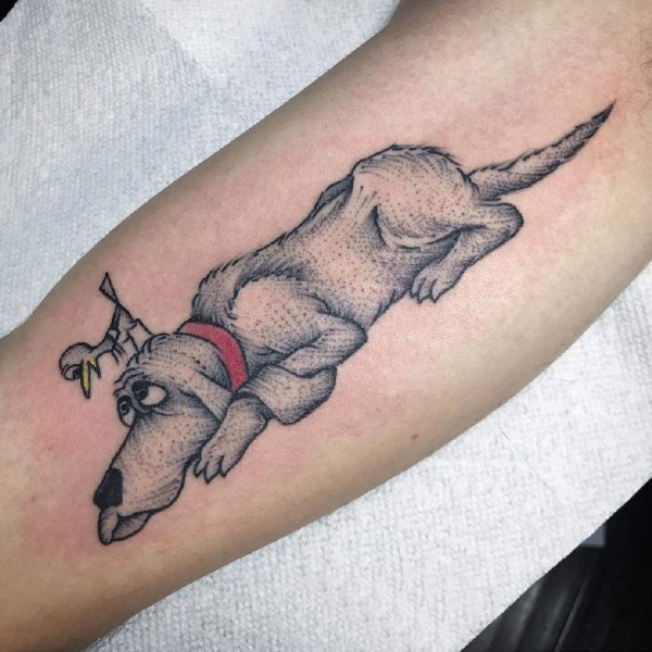 纹身卡通 男生手臂上彩色的小狗纹身图片